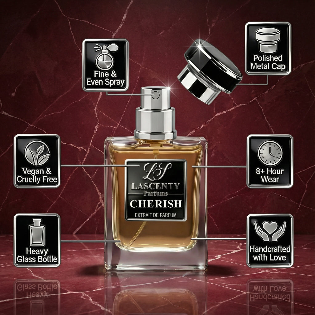Cherish by LaScenty is an Extrait de Parfum formulated with 30 to 40% Aromatic Compounds to create strong projection and a noticeable scent trail that lasts for extended periods. To give you an idea of the concentration, check out the details below